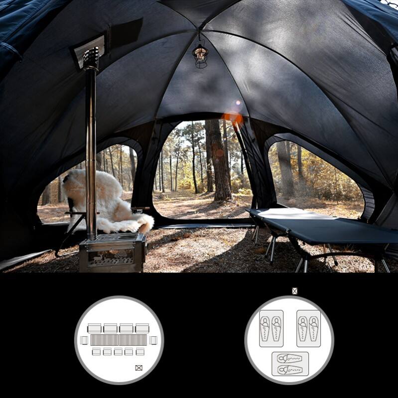 The scale of this tent is monumental. Designed to comfortably accommodate ten adults, the interior is a vast, communal living space. The dome structure provides generous headroom throughout most of the floor plan, allowing occupants to stand and move freely. The space can be intuitively zoned—a dedicated area for sleeping with multiple air mattresses, a central "living room" for socializing, cooking, and dining, and organized gear storage in the vestibules. Large, dual-layer windows (with a mesh inner layer and a storm-proof outer cover) provide ample ventilation to manage humidity and offer panoramic views, while multiple interior pockets and gear lofts keep the living area tidy and organized. This thoughtful layout fosters a true sense of community and shared adventure, making it ideal for extended expeditions, large family reunions, or group hunting trips.